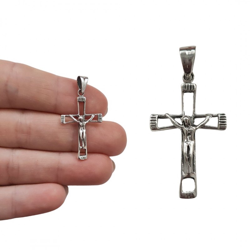 COLGANTE PLATA DE LEY SILUETA CRUZ HUECA CON CRISTO CENTRAL 3.5 CMS X 2 CMS