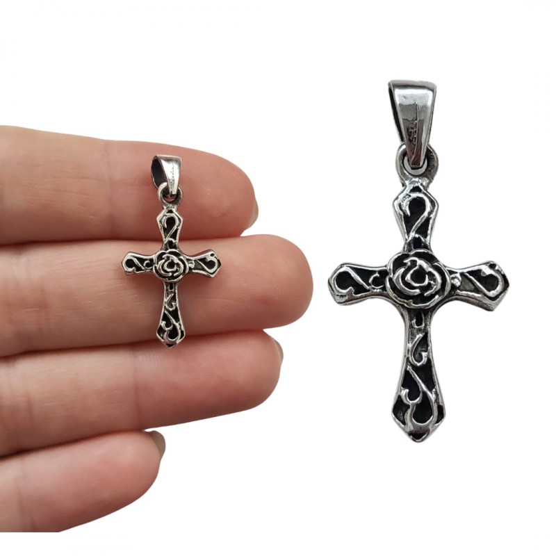 COLGANTE PLATA DE LEY ENVEJECIDA CRUZ ROSA CENTRAL LABRADA 3 CMS ALTURA X 1.5 CMS ANCHURA