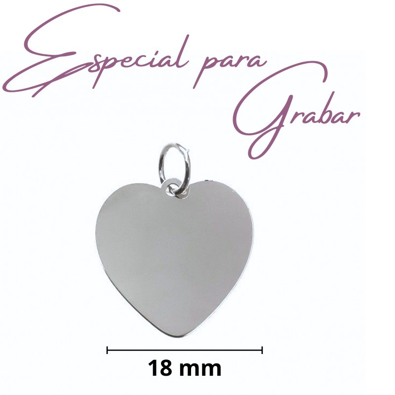 COLGANTE MEDALLA PLATA DE LEY LISA PLANA EN FORMA DE CORAZÓN, ESPECIAL PARA GRABAR, 18 MM DE ALTO Y ANCHO