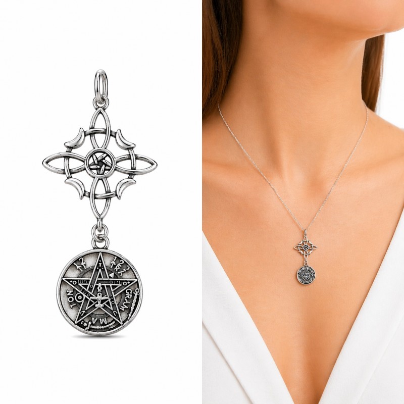 COLGANTE PLATA DE LEY NUDO DE BRUJA 4 LUNAS + TETRAGRAMATON PLATATA ENVEJECIDA. NO INCLUYE CADENA
