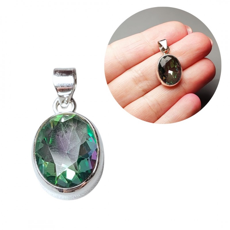 Colgante fabricado en plata de ley 925 milésimas estilo ovalado de 1,6 mm de alto por 1,2 mm de ancho formado por una piedra central natural de topacio místico facetado. Se entrega en estuche de regalo. Envíos rápidos en 24-72 horas laborables a península.