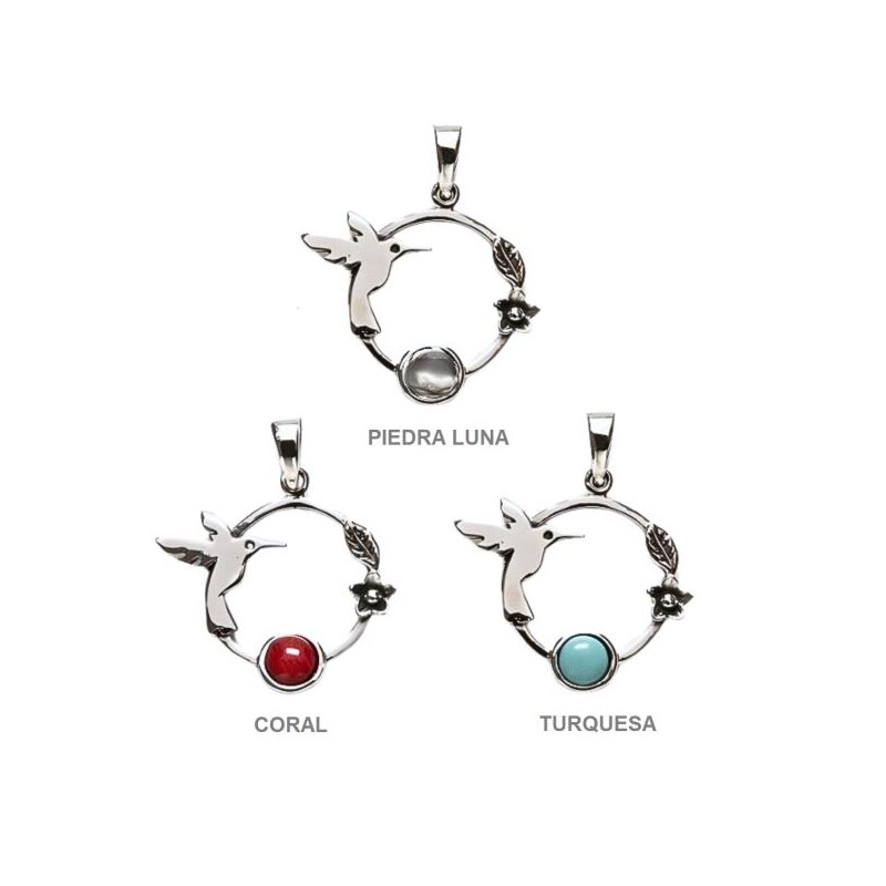 Colgante fabricado en plata de ley 925 mm en forma circular, con un colibrí en un lateral y una piedra natural inferior redonda, a elegir en el momento de la compra, entre piedra de luna, coral o turquesa. Se entrega en estuche de regalo. Entregas rápidas en 24-72 horas laborables a península.