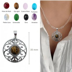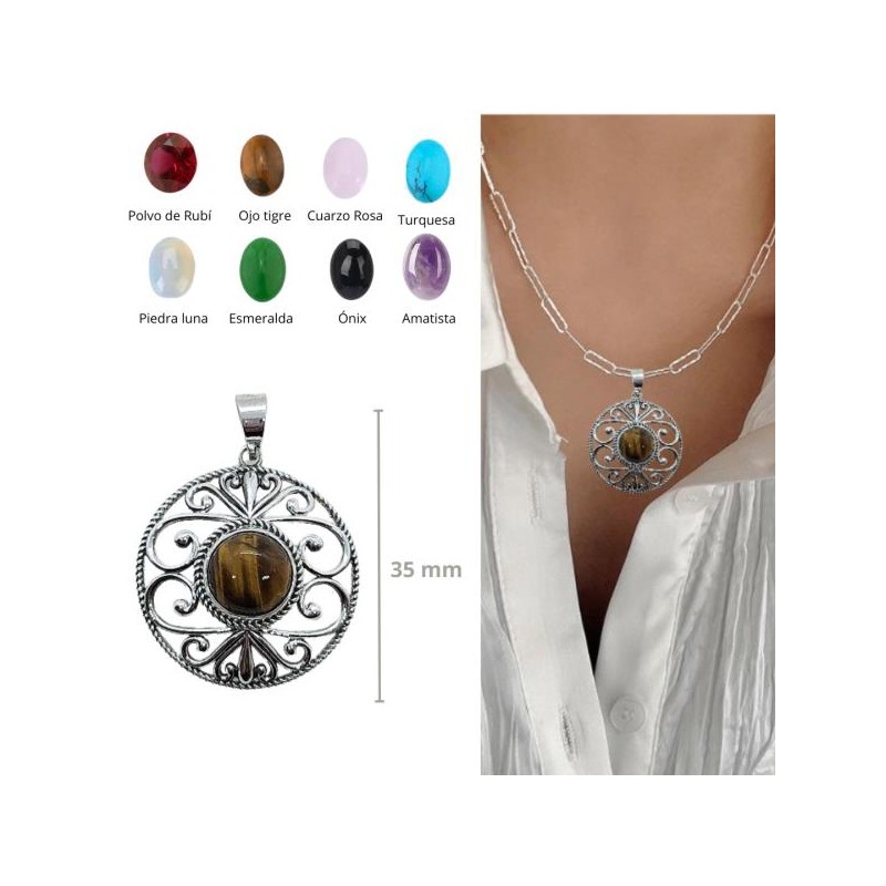 COLGANTE PLATA DE LEY REDONDO PIEDRA CENTRAL A ELEGIR FILIGRANA ALREDEDOR 3.5 DE ALTURA