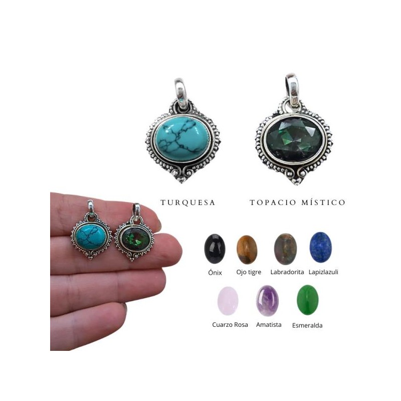COLGANTE PLATA DE LEY PIEDRA OVALADA HORIZONTAL FILIGRANA ALREDEDOR, DIFERENTES PIEDRAS A ELEGIR