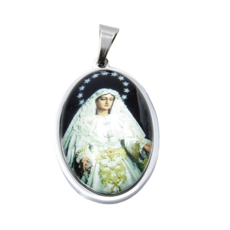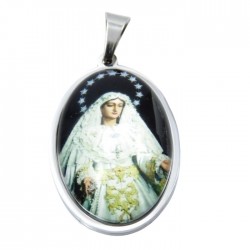 Colgante fabricado en acero y vinilo, con la imagen de la Virgen del Rocío. Dimensiones: 36 mm de altura x 23 mm de anchura. No incluye cadena. Se entrega en estuche de regalo.
