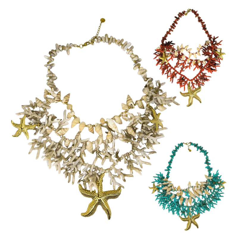 COLLAR ACERO INOXIDABLE CONCHAS NATURALES, TRES FILAS, EN TRES COLORES A ELEGIR, CON ESTRELLA DE MAR DORADA
