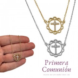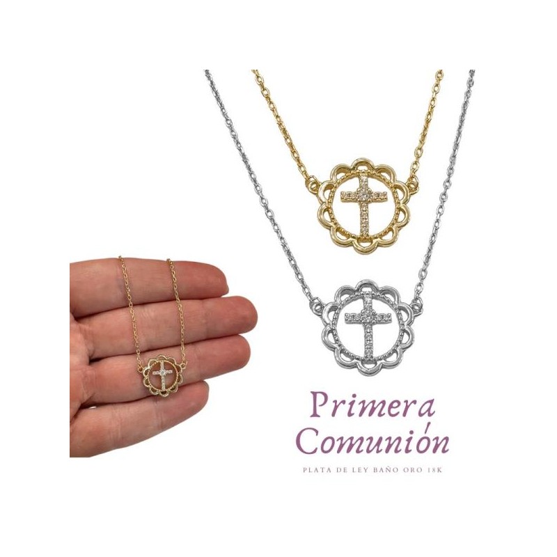 GARGANTILLA PLATA DE LEY ESPECIAL COMUNIÓN 40 CM + 4 CM CADENA ALARADORA, CRUZ CENTRAL CON CIRCONITAS BLANCAS