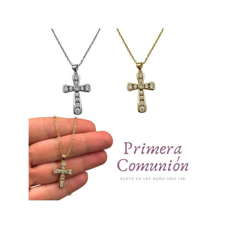 GARGANTILLA PLATA DE LEY CRUZ, ESPECIAL COMUNION, BISELADA CON CIRCONITAS REDONDAS EMBUTIDAS, DOS ACABADOS, PLATA O BAÑADAS EN