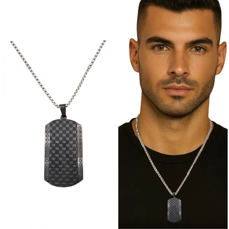 Collar para caballero en acero inoxidable con placa negra rectangular de 4 x 2 cm y cadena de 60 cm + 6 cm de alargador. Un diseño sobrio, masculino y moderno, perfecto para llevar a diario o como complemento con carácter. Resistente al agua y al uso continuo. Ideal como regalo elegante y duradero.