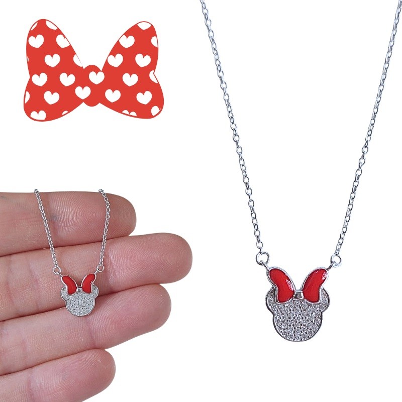 GARGANTILLA PLATA DE LEY CARITA RATONA DE CIRCONITA Y LAZO ROJO 41 CMS +5CM DE LONGITUD