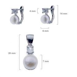Conjunto fabricado en plata de ley 925 mm, bañados en rodio que le aportan la apariencia del oro blanco. Formado por colgante y pendientes de cierre catalán a juego. Las piezas están compuestas por unas perlas sintéticas y circonitas blancas. Se adjunta imagen con medidas. Se entrega en estuche de regalo.