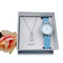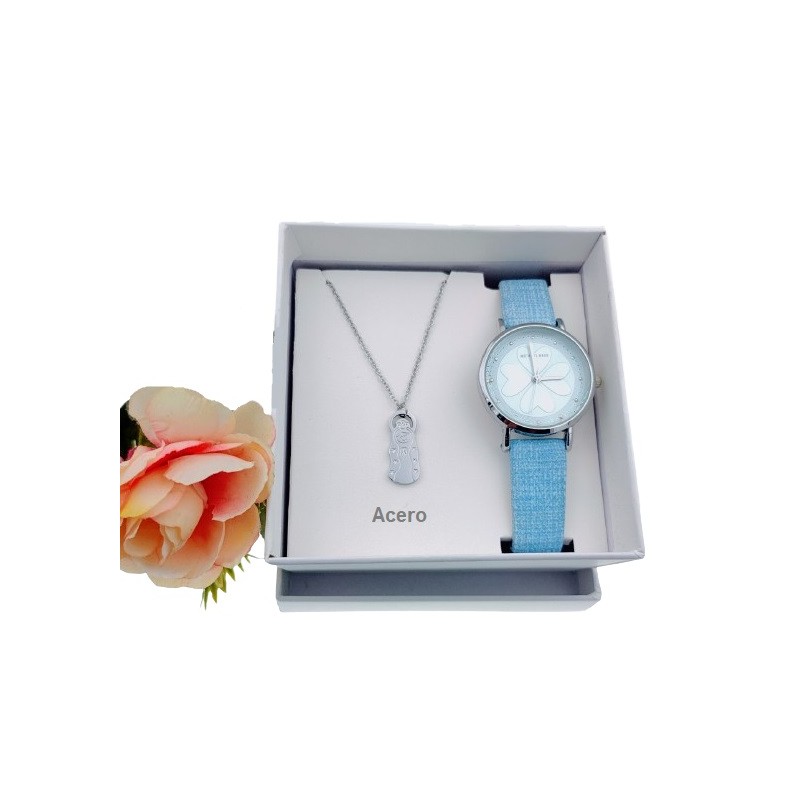 Conjunto formado por reloj con correa azul y trebol en la parte interior de la caja, con mecanismo japonés y 2 años de garantía. Se entrega en estuche de Comunión, junto con un collar fabricado en acero de 45 cms de longitud y con una medalla en forma de la Virgen Niña. En la parte trasera, cuenta con un mensaje que pone " Virgencita cuídame xfis". Envíos rápidos en 24-48 horas laborables a península.