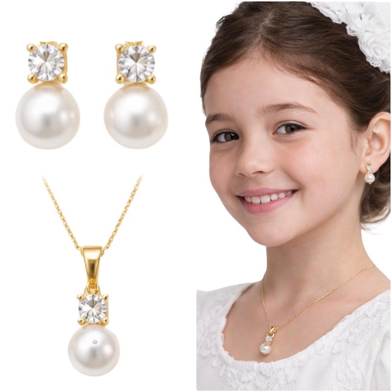 Conjunto de comunion en plata de ley bañado en oro de 18k con circonita y perla ideal para ocasiones especiales. Incluye cierre tipo ballestilla seguro y comodo. Se entrega en estuche de regalo. Envio gratis en pedidos superiores a 20 euros resto de pedidos 3 euros entregas rapidas a peninsula en 24 a 72 horas laborables