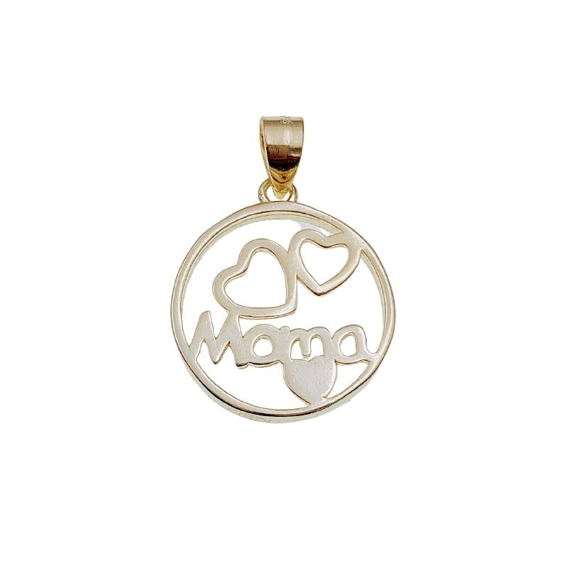 Colgante fabricado en plata de ley 925 mm, bañado en oro de 18k, con la palabra Mamá y varios corazones. Se entrega en estuche de regalo. No incluye cadena.