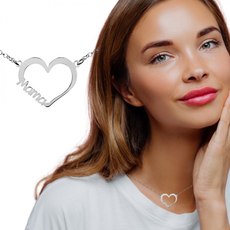 Gargantilla fabricada en plata de ley 925mm, con corazón calado con la inscripción MAMA en uno de sus laterales de 2CM de ancho y 1.8CM de alto. Incluye cadena de 45CM de largo. Se entrega en estuche de regalo. Además, viene en un precioso cartel con la frase emotiva `` Gracias por todo mamá".