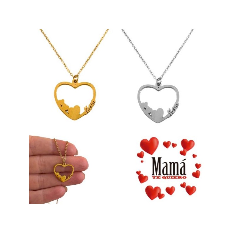 GARGANTILLA ACERO INOXIDABLE SILUETA CORAZON, CORAZONES INFERIORES Y MOM EN LATERAL. DISPONIBLE EN ACERO O ACERO BAÑADO EN ORO D