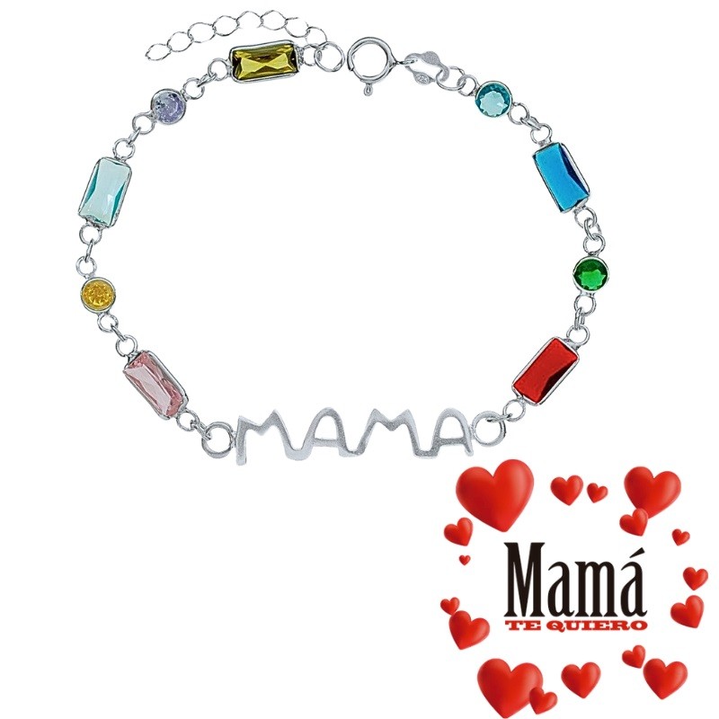 PULSERA PLATA DE LEY CIRCONITAS COLORES RECTANGULARES MAMA CENTRAL 20 CM LONGITUD