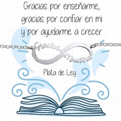 PULSERA PLATA DE LEY INFINITO GRACIAS MAESTRA CON TARJETA DE MENSAJE EMOTIVO