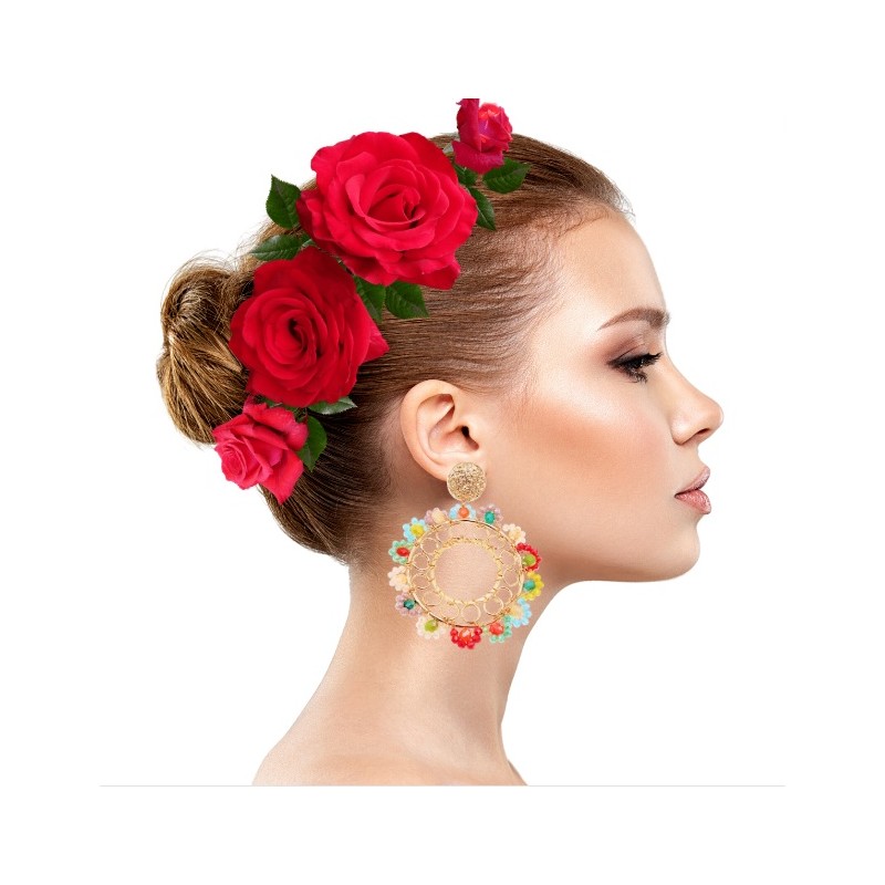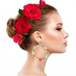 Pendientes fabricados en metal bisutería. En forma circular, cuenta con pequeñas piezas de plástico colorines facetados que le aporta mucho brillo a la pieza. Ideales para lucir en feria. Envíos rápidos en 24-48 horas laborables a península. Dimensiones: 8 cms de altura x 7 cms de anchura.