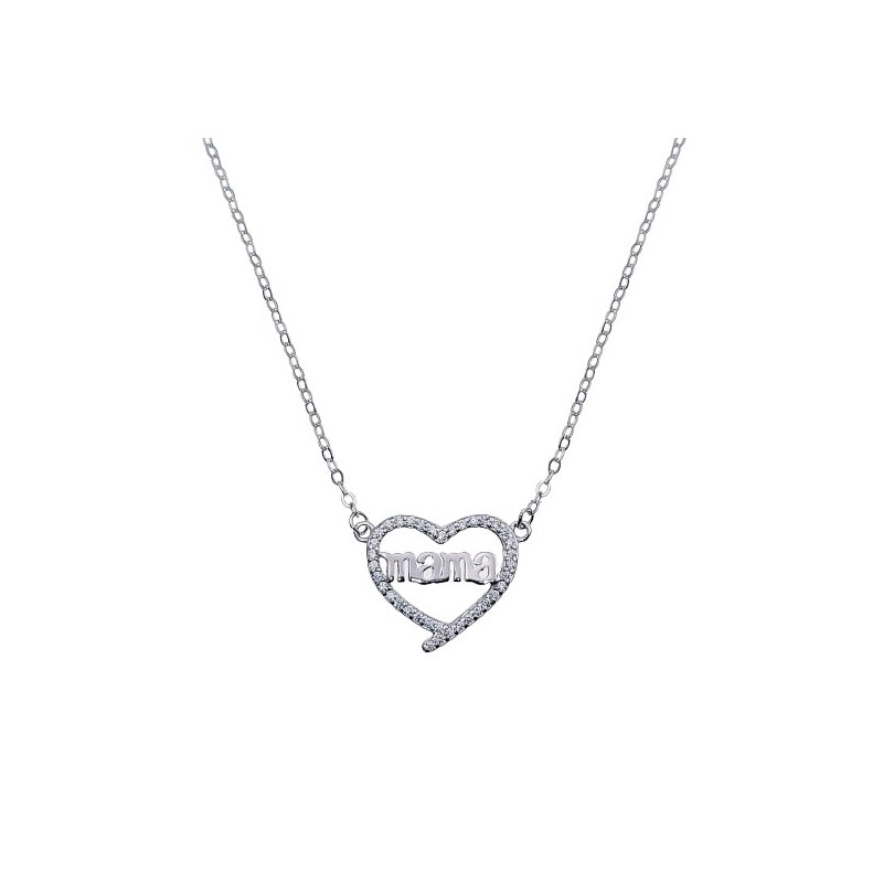 Gargantilla fabricada en plata de ley, bañada en rodio, en forma de corazón compuesto por circonitas blancas y la palabra "mamá" en el centro. Incluye cadena de 40 cms + 4 cms de cadena alargadora. Se entrega empaquetado para regalo.