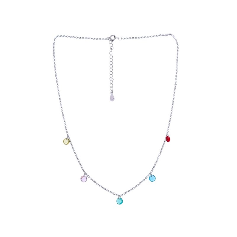 Gargantilla fabricada en plata de ley 925 milésimas, con 5 circonitas redondas colgando de colores. Longitud 40 cms + 6 cm de cadena alargadora alargadora, que permite su colocación a diferentes alturas en el cuello. Se entrega en estuche de regalo. Envíos rápidos a península en 24-72 horas laborables.