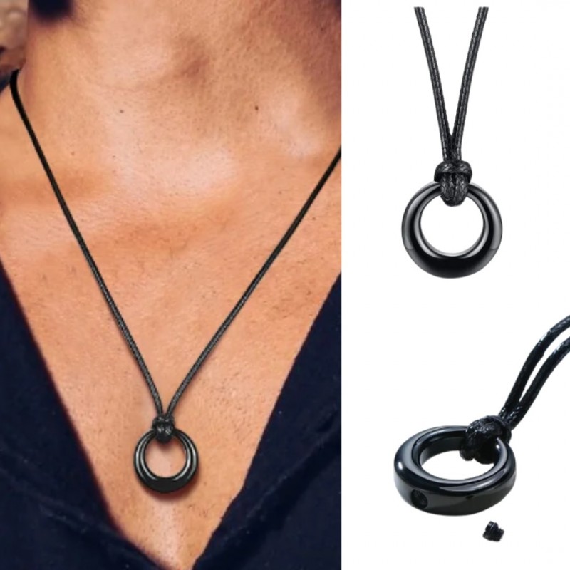 Collar fabricado en acero inoxidable, lacado en negro, en forma de círculo que representa el infinito, la vida eterna. Urna guarda cenizas, con un tornillo que cuenta con una goma de silicona que lo convierte en impermeable. Cuenta con un cordón de trenzado negro textil y un cierre en acero. Dimensiones del cordon: 60 cms + 6 cms de cadena alargadora. Dimensiones del colgante: 24 mm de diámetro.