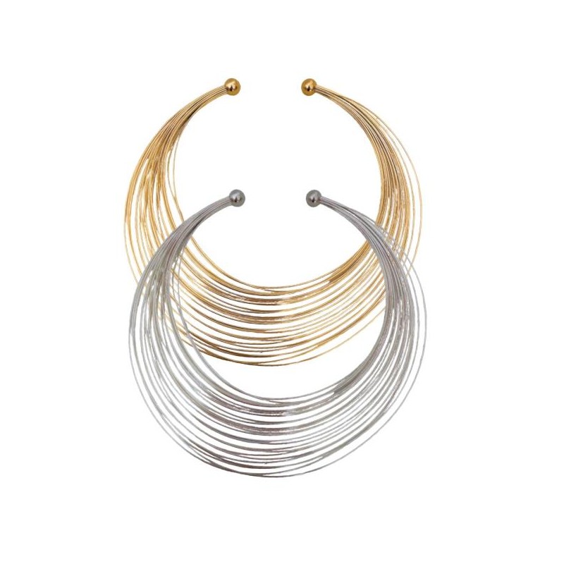 Collar o chocker fabricado en acero inoxidable formado por multi hilos de diferentes medidas. Cuenta en su parte trasera por dos bolas en los extremos que proporcionan comodidad. Su apertura puede abrirse o cerrarse para adecuarse a cualquier tamaño de cuello. Disponible en dos acabados: acero o acero bañado en oro de 18k. Se entrega embuelta en papel de seda. Entregas rápidas en 24-72 horas laborables a península.