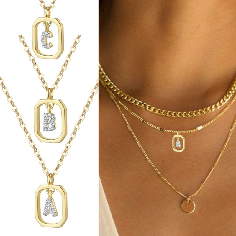 GARGANTILLA PLATA DE LEY BAÑADA EN ORO DE 18K CON INICIAL DE CIRCONITA BLANCA ENMARCADA EN UN BISEL RECTANGULAR