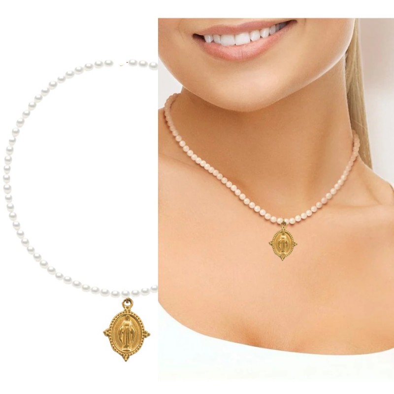 GARGANTILLA PERLAS SINTÉTICAS DE 4 MM DIÁMETRO Y VIRGEN DE LA MILAGROSA EN ACERO BAÑADA EN ORO DE 18K