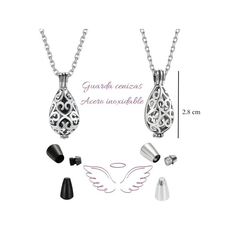 COLLAR ACERO INOXIDABLE URNA CENIZAS EN FORMA DE LÁGRIMA LABRADA, EN DOS ACABADOS: NEGRO O PLATEADO. INCLUYE CADENA DE 55 CMS