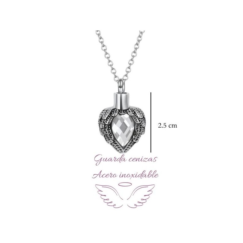 COLLAR ACERO INOXIDABLE CORAZÓN ALAS CRISTAL BLANCO CENTRAL, GUARDA CENIZAS. INCLUYE CADENA DE 55 CMS