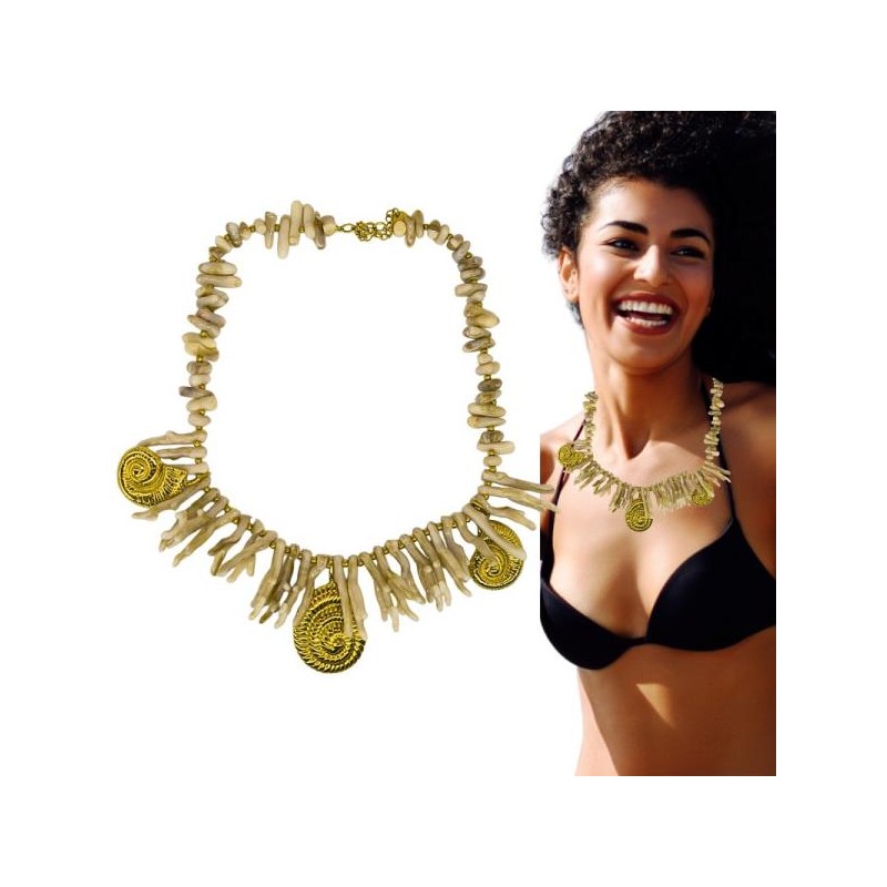 Collar de acero inoxidable con baño de oro 18K, decorado con caracolas colgantes y piezas de símil coral de nácar. Diseño inspirado en el mar, fresco y elegante. Ideal para el verano o looks bohemios. Se entrega en estuche de regalo. Envío gratis en compras superiores a 20 euros. Coste de envío 3 euros para el resto. Entregas rápidas en 24 a 72 horas laborables a península.