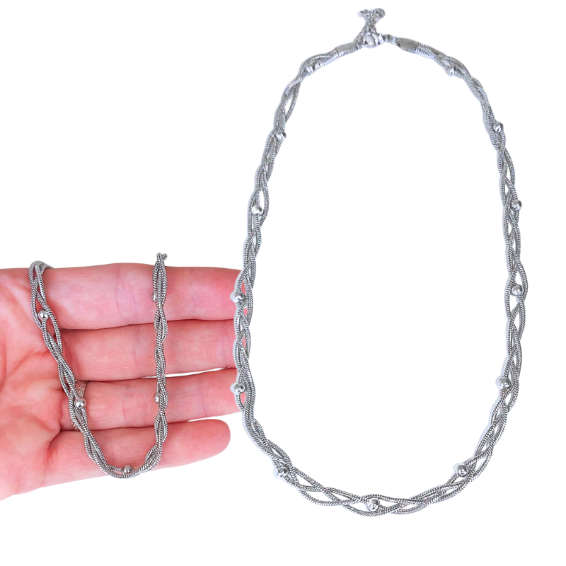 Gargantilla de acero trenzada 3 hilos con bolas, elegante y resistente. Incluye cadena alargadora de 5 cm para un ajuste perfecto. Entregas rápidas en 24 a 72 horas laborables a península. Envíos gratis en compras superiores a 20 euros y resto de pedidos por solo 3 euros. Se entrega en estuche de regalo, ideal para sorprender con estilo y calidad al mejor precio online.