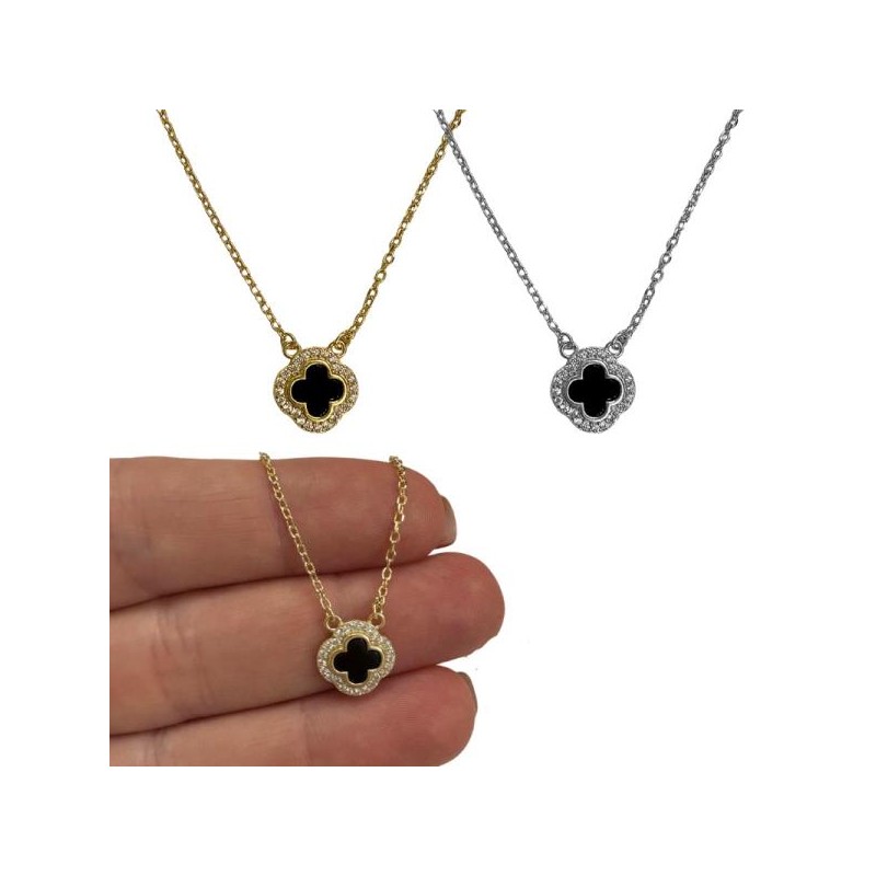 GARGANTILLA PLATA DE LEY TREBOL NEGRO CON CIRCONITAS ALREDEDOR DOS ACABADO: PLATA RODIADA Y PLATA BAÑADA ORO 18K