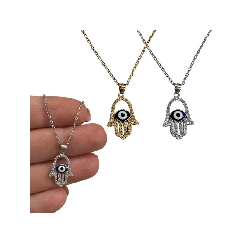 Gargantilla de plata de ley con colgante de mano de fatima y ojo turco en su interior, disponible en acabado plata rodiada o plata bañada en oro de 18k. Una joya protectora y elegante para realzar tu estilo y atraer buena energia. Entregas rápidas en 24 a 72 horas laborables a península. Se entrega en estuche de regalo. Envíos gratis desde 20 euros y solo 3 euros en pedidos inferiores.