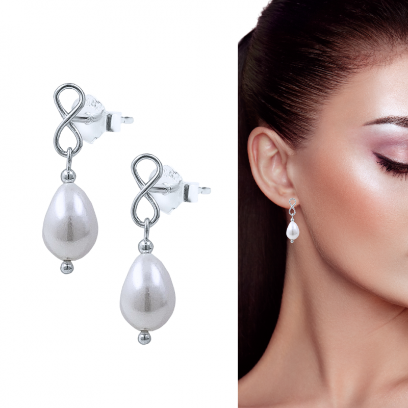 PENDIENTES PLATA DE LEY INFINITO SUPERIOR Y PERLA INFERIOR EN FORMA DE LÁGRIMA, CIERRE DE PRESIÓN