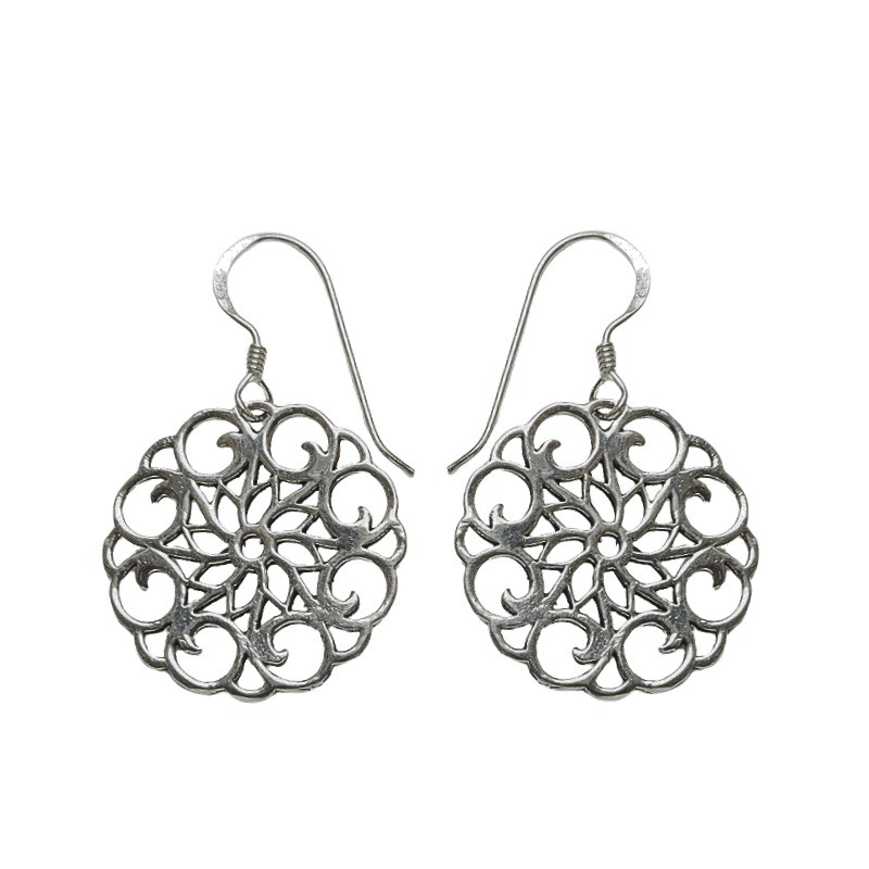 Pendientes de plata de ley labrados con diseno circular tipo mandala de 20 mm de diametro y cogida hippie. Estilo boho y artesanal ideal para looks casual y espirituales. Entregas rapidas en 24 a 72 horas laborables en peninsula. Se entregan en estuche de regalo. Envio gratis desde 20 euros resto 3 euros.
