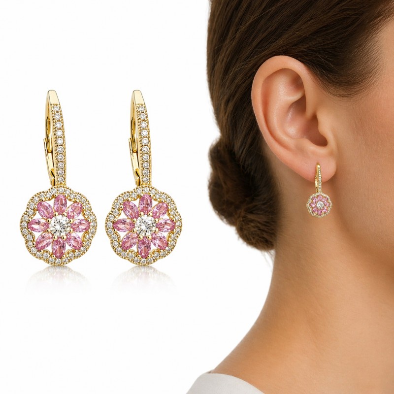 PENDIENTES PLATA DE LEY BAÑO ORO 18 K FLOR CIRCONITAS ROSAS ALTA JOYERÍA