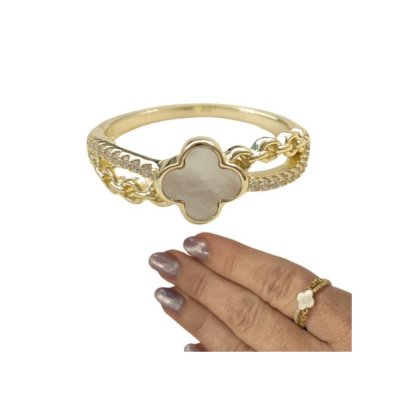 ANILLO PLATA DE LEY BAÑADO ORO 18K FLOR CENTRAL ANACARADA DOBLE CADEN A AMBOS LADOS Y CIRCONITAS, VENTA POR TALLAS