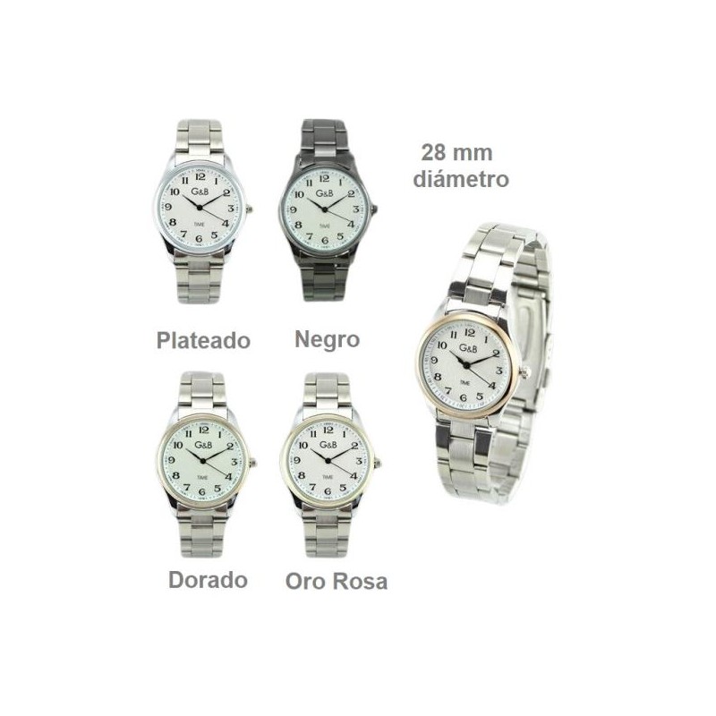 Reloj señora marca G&B Time, con correa y caja metálica, de 28 mm de diámetro. Se entrega en cajita de regalo. Envíos rápidos en 24-72 horas laborables a península.