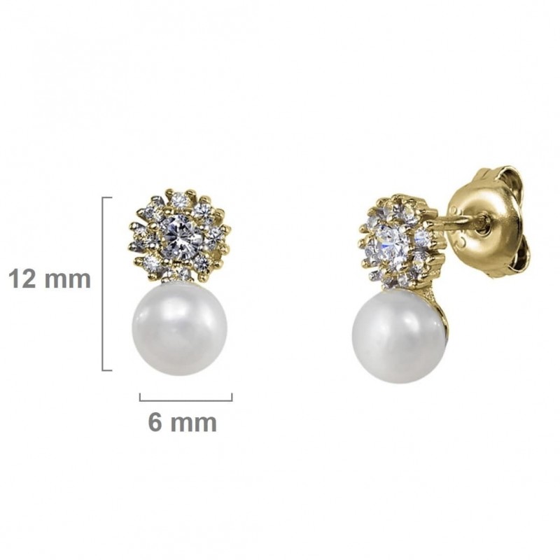 Pendientes fabricados en plata de ley 925 mm, bañados en oro de 18k. Cuentan con un cierre de tipo presión de mariposa, muy códomo y elegante. Se compone de una parte superior formada por circonitas blancas y una perla inferior de 6 mm de diámetro. Se vende, por separado, el anillo a juego. Ideal para ocasiones especiales como la Primera Comunión. Se entregan en estuche de regalo. Envío en 24-48 horas laborables.