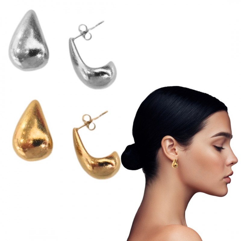 Pendientes fabricados en acero inoxidable o acero bañado en oro de 18 kilates en forma de gota con cierre de presión tipo mariposa. Dos terminaciones diferentes a elegir en el momento de la compra. Se entrega en estuche de regalo. Envíos rápidos a península en 24-72 horas laborables.