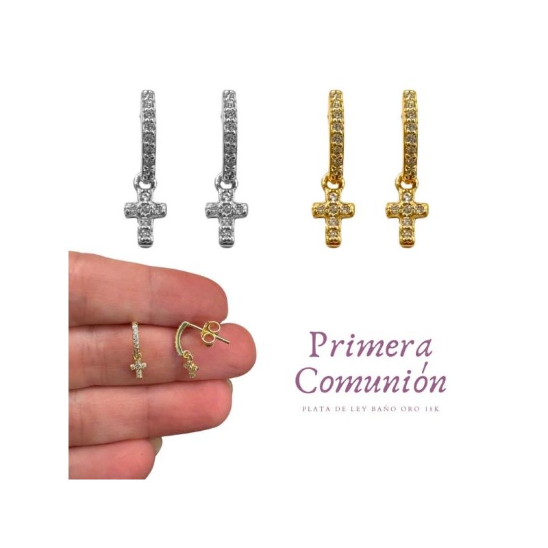 PENDIENTES PLATA DE LEY CIERRE DE PRESIÓN CIRCONITAS BLANCAS, CRUZ COLGANDO, DOS ACABADOS A ELEGIR: DORADO O PLATEADO