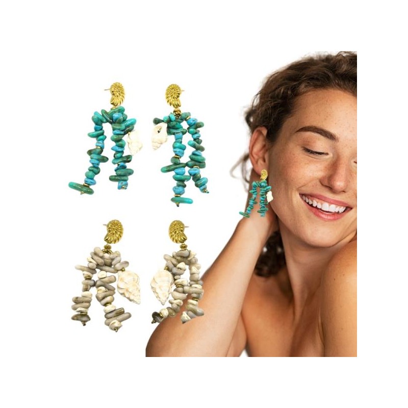 PENDIENTES ACERO INOXIDABLE CONCHA BAÑADA ORO 18K, CON TRES FILAS DE PIEDRAS Y CONCHA NATURAL COLGANDO