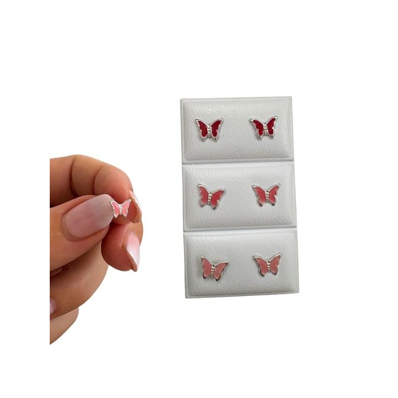 Pendientes infantiles de plata de ley con forma de mariposa lacada, tamaño 7 x 7 mm. Con cierre de presión, ideales para niñas por su diseño alegre y seguro. Fabricados con materiales hipoalergénicos. Se entregan en estuche de regalo. Envíos gratis para compras superiores a 20 euros. Resto de pedidos 3 euros. Entregas rápidas en 24 a 72 horas laborables a península.