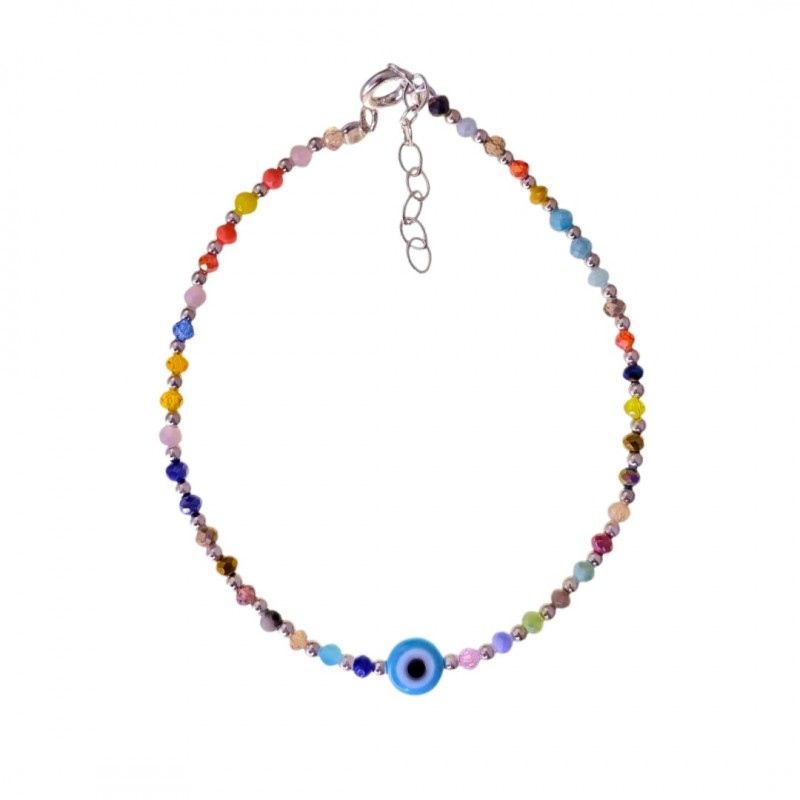 PULSERA PLATA DE LEY PIEDRAS COLORES 2.5 MM + BOLITAS PLATA DE 2 MM + OJO TURCO CENTRAL DE 6 MM DIÁMETRO.
