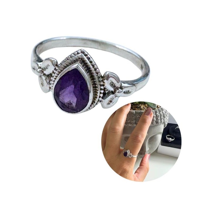ANILLO PLATA DE LEY AMATISTA NATURAL PIEDRA CENTRAL EN FORMA DE LAGRIMA. VENTA POR TALLAS