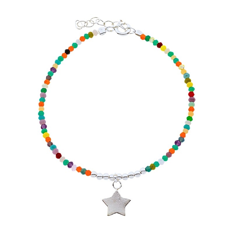 Pulsera de plata de ley con pequeñas piedras de colores y estrella lisa colgante. Elegante y delicada, perfecta para cualquier ocasión. Entregas rápidas en 24 a 72 horas laborables a península. Incluye estuche de regalo. Envío gratis para compras superiores a 20 euros. Para pedidos menores, solo 3 euros. Un detalle especial y lleno de color.