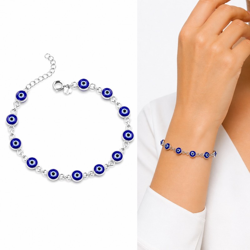 Pulsera de plata de ley con ojos turcos azules de 6 mm simbolo de proteccion. Diseno delicado y ajustable con longitud de 16 mas 3 cm para mayor comodidad. Ideal para uso diario y como amuleto. Entregas rapidas en 24 a 72 horas laborables en peninsula. Incluye estuche de regalo. Envio gratis desde 20 euros resto 3 euros