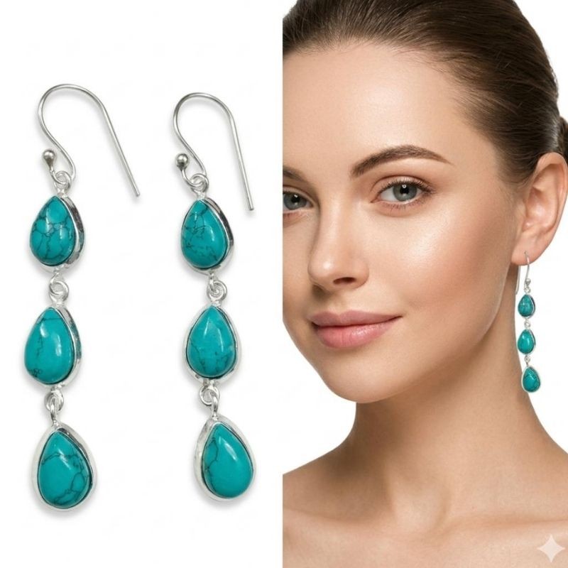 Pendientes de plata de ley 925 con tres piedras turquesas naturales en forma de lágrima que aportan un estilo boho elegante y lleno de color. Su cierre hippie garantiza comodidad durante todo el día. Perfectos para dar un toque único a cualquier look. Entregas 24 a 72 horas laborables, estuche de regalo y envío gratis desde 20€
